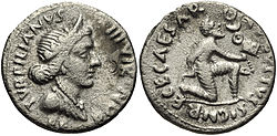 Royal women appear to have been less included in royal representation.[280] Artwork depicts royal women dressed similarly to those of the Achaemenid period: in long-sleeved, many-folded dresses tied by a belt, with a tiara or a veil hanging down their back.[280] While their names and titles did appear in official documents, Parthian women were rarely depicted in art. Only two royal women were ever depicted on Parthian coins: queen Musa of Parthia and queen Anzaze of Elymais.[280] Only two women are known to have ruled the Parthian Empire, one as monarch and one as regent. Musa of Parthia is the only woman confirmed to have ruled as queen regnant of the Parthian Empire, while Rinnu, mother of underage king Phraates II, is the only other woman believed to have been a ruler, in her case as a queen regent instead of a queen regnant.[283][284]