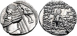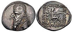 Although Greek culture of the Seleucids was widely adopted by peoples of the Near East during the Hellenistic period, the Parthian era witnessed an Iranian cultural revival in religion, the arts, and even clothing fashions.[227] Conscious of both the Hellenistic and Persian cultural roots of their kingship, the Arsacid rulers styled themselves after the Persian King of Kings and affirmed that they were also philhellenes ("friends of the Greeks").[228] The word "philhellene" was inscribed on Parthian coins until the reign of Artabanus II.[229] The discontinuation of this phrase signified the revival of Iranian culture in Parthia.[230] Vologases I was the first Arsacid ruler to have the Parthian script and language appear on his minted coins alongside the now almost illegible Greek.[231] However, the use of Greek-alphabet legends on Parthian coins remained until the collapse of the empire.[232]