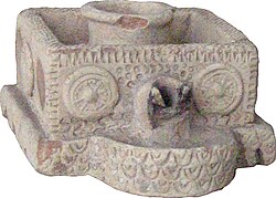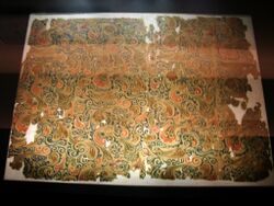 Common motifs of the Parthian period include scenes of royal hunting expeditions and the investiture of Arsacid kings.[254] Use of these motifs extended to include portrayals of local rulers.[252] Common art mediums were rock-reliefs, frescos, and even graffiti.[252] Geometric and stylized plant patterns were also used on stucco and plaster walls.[253] The common motif of the Sasanian period showing two horsemen engaged in combat with lances first appeared in the Parthian reliefs at Mount Behistun.[255]