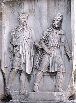 Trajan's successor Hadrian (r. 117–138 AD) reaffirmed the Roman-Parthian border at the Euphrates, choosing not to invade Mesopotamia due to Rome's now limited military resources.[158] Parthamaspates fled after the Parthians revolted against him, yet the Romans made him king of Osroene. Osroes I died during his conflict with Vologases III, the latter succeeded by Vologases IV of Parthia (r. c. 147–191 AD) who ushered in a period of peace and stability.[159] However, the Roman–Parthian War of 161–166 AD began when Vologases invaded Armenia and Syria, retaking Edessa. Roman emperor Marcus Aurelius (r. 161–180 AD) had co-ruler Lucius Verus (r. 161–169 AD) guard Syria while Marcus Statius Priscus invaded Armenia in 163 AD, followed by the invasion of Mesopotamia by Avidius Cassius in 164 AD.[160] The Romans captured and burnt Seleucia and Ctesiphon to the ground, yet they were forced to retreat once the Roman soldiers contracted a deadly disease (possibly smallpox) that soon ravaged the Roman world.[161] Although they withdrew, from this point forward the city of Dura-Europos remained in Roman hands.[162] When Roman emperor Septimius Severus (r. 193–211 AD) invaded Mesopotamia in 197 AD during the reign of Vologases V of Parthia (r. c. 191–208 AD), the Romans once again marched down the Euphrates and captured Seleucia and Ctesiphon. After assuming the title Parthicus Maximus, he retreated in late 198 AD, failing as Trajan once did to capture Hatra during a siege.[163]