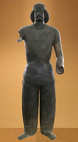 The typical Parthian riding outfit is exemplified by the famous bronze statue of a Parthian nobleman found at Shami, Elymais. Standing 1.9 m (6 ft), the figure wears a V-shaped jacket, a V-shaped tunic fastened in place with a belt, loose-fitting and many-folded trousers held by garters, and a diadem or band over his coiffed, bobbed hair.[267] His outfit is commonly seen in relief images of Parthian coins by the mid-1st century BC.[230]