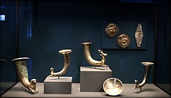 Parthian architecture adopted elements of Achaemenid and Greek architecture, but remained distinct from the two. The style is first attested at Mithridatkert/Nisa.[262] The Round Hall of Nisa is similar to Hellenistic palaces, but different in that it forms a circle and vault inside a square space.[262] However, the artwork of Nisa, including marble statues and the carved scenes on ivory rhyton vessels, is unquestionably influenced by Greek art.[263]