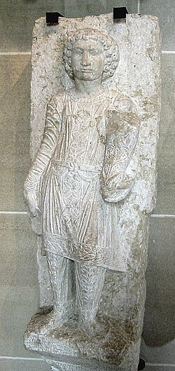 Examples of clothing in Parthian inspired sculptures have been found in excavations at Hatra, in northwestern Iraq. Statues erected there feature the typical Parthian shirt (qamis), combined with trousers and made with fine, ornamented materials.[268] The aristocratic elite of Hatra adopted the bobbed hairstyles, headdresses, and belted tunics worn by the nobility belonging to the central Arsacid court.[265] The trouser-suit was even worn by the Arsacid kings, as shown on the reverse images of coins.[269] The Parthian trouser-suit was also adopted in Palmyra, Syria, along with the use of Parthian frontality in art.[270]