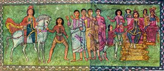 The hereditary titles of the hierarchic nobility recorded during the reign of the first Sasanian monarch Ardashir I most likely reflect the titles already in use during the Parthian era.[205] There were three distinct tiers of nobility, the highest being the regional kings directly below the King of Kings, the second being those related to the King of Kings only through marriage, and the lowest order being heads of local clans and small territories.[206]