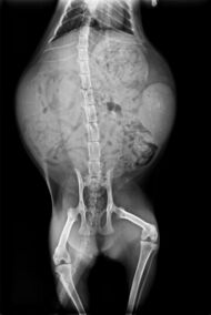 Cats have seven cervical vertebrae (as do most mammals); 13 thoracic vertebrae (humans have 12); seven lumbar vertebrae (humans have five); three sacral vertebrae (as do most mammals, but humans have five); and a variable number of caudal vertebrae in the tail (humans have only three to five vestigial caudal vertebrae, fused into an internal coccyx).[49]:11 The extra lumbar and thoracic vertebrae account for the cat's spinal mobility and flexibility. Attached to the spine are 13 ribs, the shoulder, and the pelvis.[49]:16 Unlike human arms, cat forelimbs are attached to the shoulder by free-floating clavicle bones which allow them to pass their body through any space into which they can fit their head.[50]