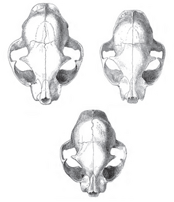 Skulls of a wildcat (top left), a housecat (top right), and a hybrid between the two. (bottom center)