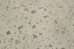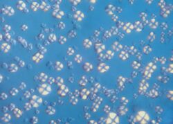 Another common approach is to dislodge the starch grains through sonication, which is a laboratory technique that uses sound waves to "agitate particles" in order to convert an electrical signal into a vibration which in turn breaks down a substance.[5] In terms of starch grain analysis, the starch grains are released by use of an ultrasonic bath and the distilled water containing the sample particles is then centrifuged. This is the process in which the specimens are spun and separated by density as a result of centripetal force, or due to the fictitious centrifugal force that is felt by the specimens due to their reference frame.[6] Utilizing this force allows for the separation of solutions of different densities.[6] Thus the least dense component, consisting of the starch grain particles is separated and a microscopic slide can be prepared.[1]