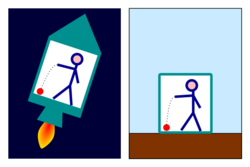 Conversely, one might expect that inertial motions, once identified by observing the actual motions of bodies and making allowances for the external forces (such as electromagnetism or friction), can be used to define the geometry of space, as well as a time coordinate. However, there is an ambiguity once gravity comes into play. According to Newton's law of gravity, and independently verified by experiments such as that of Eötvös and its successors (see Eötvös experiment), there is a universality of free fall (also known as the weak equivalence principle, or the universal equality of inertial and passive-gravitational mass): the trajectory of a test body in free fall depends only on its position and initial speed, but not on any of its material properties.[28] A simplified version of this is embodied in Einstein's elevator experiment, illustrated in the figure on the right: for an observer in an enclosed room, it is impossible to decide, by mapping the trajectory of bodies such as a dropped ball, whether the room is stationary in a gravitational field and the ball accelerating, or in free space aboard a rocket that is accelerating at a rate equal to that of the gravitational field versus the ball which upon release has nil acceleration.[29]