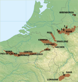 When iron and later steel became important in Wallonia around 1830, the Belgian coal industry had long been established and used steam engines for pumping. The Belgian coalfield lay near the navigable river Meuse, so coal was shipped downstream to the ports and cities of the Rhine-Meuse-Scheldt delta. The opening of the Saint-Quentin Canal in 1810 allowed coal to go by barge to Paris. The Belgian coalfield outcrops over most of its area, and the highly folded nature of the coal seams, part of the geological Rhenohercynian Zone, meant that surface occurrences of the coal were very abundant. Deep mines were not required at first, so a large number of small operations sprang up. There was a complex legal system for concessions, and often multiple layers had different owners. Entrepreneurs started going deeper and deeper, thanks to the good pumping system. In 1790, the maximum depth of mines was 220 meters (720 ft). By 1856, the average depth in the Borinage was 361 meters (1,184 ft), and in 1866, 437 meters (1,434 ft) and some pits had reached down 700 to 900 meters (2,300 to 3,000 ft); one was 1,065 meters (3,494 ft) deep, probably the deepest coal mine in Europe at this time. Gas explosions were a serious problem, and Belgium had high coal miner fatality rates. By the late 19th century the seams were becoming exhausted, and the steel industry was importing some coal from the Ruhr.[23] André Dumont's discovery in 1900 of coal in the Campine basin, in the Belgian Province Limburg, prompted entrepreneurs from Liège to open coal mines, mainly producing coal for the steel industry. An announced re-organisation of the Belgian coal mines in 1965 resulted in strikes and a revolt which led to the death of two coal miners in 1966 at the Zwartberg mine. Coal was mined in the Liège basin until 1980, in the Southern Wallonian basin until 1984, and in the Campine basin until 1992.