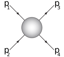 where p1 and p2 are the four-momenta of the incoming particles and p3 and p4 are the four-momenta of the outgoing particles.