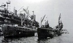 The AM (A Modified) type submarine was a large seaplane-carrying submarine, with a hangar space for two aircraft. These giant submarines were originally of the A2 type, but their design was revised after construction started so that they could carry a second aircraft. The seaplanes were to be the Aichi M6A1 bomber carrying 1,760 pounds (800 kg) bombs.