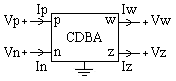 Here, the current through the z-terminal follows the difference between the currents through p-terminal and n-terminal. Input terminals p and n are internally grounded. The difference of the input currents is converted into the output voltage Vw, therefore CDBA element can be considered as a special type of current feedback amplifier with differential current input and grounded y input.