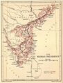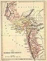 British India is shown in pink on this 1837 map. The Madras Presidency is in the southeast, the Bombay Presidency is in the west and the Bengal Presidency is in the northeast.