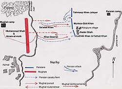 Nader Shah crushed the Mughal army in less than three hours at the large Battle of Karnal on 13 February 1739. After this decisive victory, Nader captured Mohammad Shah and entered with him into Delhi.[33] When a rumour broke out that Nader had been assassinated, some of the Indians attacked and killed Persian troops. Nader, furious, reacted by ordering his soldiers to plunder and sack the city. During the course of one day (March 22) 20,000 to 30,000 Indians were killed by the Persian troops, forcing Mohammad Shah to beg Nader for mercy.[34]