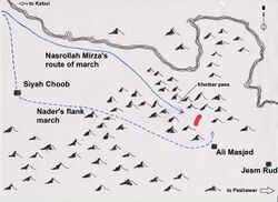 Nader used the pretext of his Afghan enemies taking refuge in India to cross the border and invade the militarily weak but still extremely wealthy far eastern empire.[31] In a brilliant campaign against the governor of Peshawar, he took a small contingent of his forces on a daunting flank march through nearly impassable mountain passes, and took the enemy forces positioned at the mouth of the Khyber Pass completely by surprise, decisively beating them despite being outnumbered two-to-one. This led to the capture of Ghazni, Kabul, Peshawar, Sindh and Lahore.