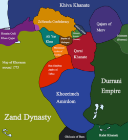 After Nader's death in 1747, his nephew Ali Qoli (who may have been involved in the assassination plot) seized the throne and proclaimed himself Adel Shah ("The Just King"). He ordered the execution of all Nader's sons and grandsons, with the exception of the 13-year-old Shahrokh, the son of Reza Qoli.[47] Meanwhile, Nadir's former treasurer, Ahmad Shah Abdali, had declared his independence by founding the Durrani Empire. In the process, the eastern territories were lost and in the following decades became part of Afghanistan, the successor-state to the Durrani Empire. The northern territories, Iran's most integral regions, had a different fate. Erekle II and Teimuraz II, who, in 1744, had been made the kings of Kakheti and Kartli respectively by Nader himself for their loyal service,[48] capitalized on the eruption of instability and declared de facto independence. Erekle II assumed control over Kartli after Teimuraz II's death, thus unifying the two as the Kingdom of Kartli-Kakheti, becoming the first Georgian ruler in three centuries to preside over a politically unified eastern Georgia,[49] and due to the frantic turn of events in mainland Iran he would be able to remain de facto autonomous through the Zand period.[50] Under the successive Qajar dynasty, Iran managed to restore Iranian suzerainty over the Georgian regions, until they would be irrevocably lost in the course of the 19th century, to neighbouring Imperial Russia.[51] Many of the rest of the territories in the Caucasus, comprising modern-day Azerbaijan, Armenia, and Dagestan broke away into various khanates. Until the advent of the Zands and Qajars, its rulers had various forms of autonomy, but stayed vassals and subjects to the Iranian king.[52] Under the early Qajars, these territories in Transcaucasia and Dagestan would all be fully reincorporated into Iran, but eventually permanently lost as well (alongside Georgia), in the course of the 19th century to Imperial Russia through the two Russo-Persian Wars of the 19th century.[51]