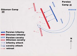 The two imperial standards were placed on the right of the square already mentioned: one of them was in stripes of red, blue, and white, and the other of red, blue, white, and yellow, without any other ornament: though the old standards required 12 men to move them, the SHAH lengthened their staffs, and made them yet heavier; he also put new colours of silk upon them, the one red and yellow striped, the other yellow edged with red: they were made of such an enormous size, to prevent their being carried off by the enemy, except by an entire defeat. The regimental colours were a narrow slip of silk, sloped to a point, some were red, some white, and some striped.[60][61]