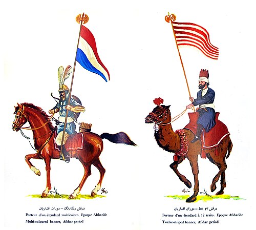 Navy Admiral flag being a white ground with a red Persian Sword in the middle.[62] Although based on the writings of Jonas Hanway, we can see that the flags of the army regiments of King Nader were three-eared, but we cannot come to a conclusion about whether the royal flags of that time were three-eared or four-eared.