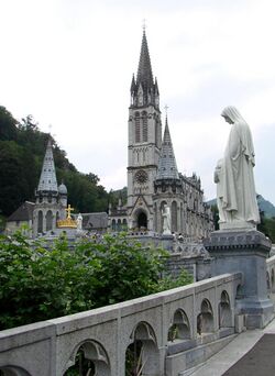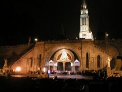 The Sanctuary of Our Lady of Lourdes (French: Sanctuaire de Notre-Dame de Lourdes; Occitan: Santuari de Nòstra Senhora de Lorda) is a Catholic Marian shrine and pilgrimage site dedicated to Our Lady of Lourdes in the town of Lourdes, Hautes-Pyrénées, France . The sanctuary includes several religious buildings and monuments around the grotto of Massabielle, the place where the events of the Lourdes apparitions occurred in 1858, among them three basilicas, the Basilica of Our Lady of the Immaculate Conception, the Rosary Basilica and the Basilica of St. Pius X, respectively known as the upper, lower and underground basilica.