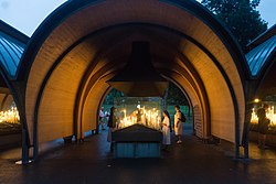 St. Joseph's Chapel, named in honor of Mary's husband Saint Joseph, is situated at the far end of the esplanade, near St. Michael's Gate. It is a modern, concrete church, mostly underground, with little natural light. It was also designed by Pierre Vago, and was consecrated on 1 May 1968. It has provision for 450 seated worshipers and 80 wheelchairs.[19]