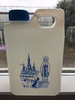 Lourdes water flows from a spring at the same spot where it was discovered by Bernadette, in the grotto of Massabielle. The original spring can be seen within the grotto, lit from below and protected by a glass screen. Pilgrims drink Lourdes water due to its reputed healing power. The water is accessed from individual taps located between the grotto and the baths. The water from Lourdes was thoroughly analysed by independent chemists in 1858 and 1859, and does not appear to have a latent power to cure and has no special scientific or medicinal properties. Despite this, the water is itself a strong symbol of devotion for Lourdes pilgrims, and many buy statues and rosary beads containing small vials of it, and take home large plastic containers of it.