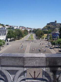 The statue of the Crowned Virgin is a statue of Our Lady of Lourdes very similar to the statue in the grotto of Massabielle. It has been known as the "crowned statue" after its canonical coronation on 3 July 1876 by papal legate Pier Francesco Meglia. The statue stands across Rosary Square from the Rosary Basilica and faces the entrance. This prominent statue is a familiar landmark and a traditional meeting point. The statue is 2.5m high and cast in bronze, painted white and blue in the traditional colours. Her rosary is of the Birgittine style and incorporates six decades.[3] Behind the Crowned Statue is the Esplanade, a large open walkway which is used for the processions.