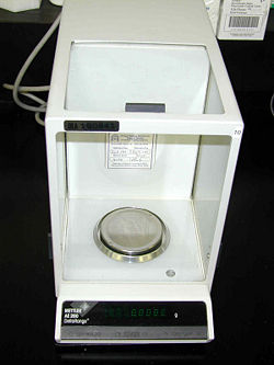 An analytical balance is an instrument used to measure mass to a very high degree of precision. The weighing pan(s) of a high accuracy (0.1 mg or better) analytical balance are inside a see-through enclosure with doors so dust does not collect and so any air currents in the room do not affect the delicate balance. Also, the sample must be at room temperature to prevent natural convection from forming air currents inside the enclosure, affecting the weighing.