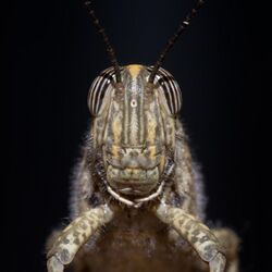 Grasshoppers are typically ground-dwelling insects with powerful hind legs which allow them to escape from threats by leaping vigorously. Their front leg is shorter and used for grasping food. As hemimetabolous insects, they do not undergo complete metamorphosis; they hatch from an egg into a nymph or "hopper" which undergoes five moults, becoming more similar to the adult insect at each developmental stage.[1] The grasshopper hears through the tympanal organ which can be found in the first segment of the abdomen attached to the thorax; while its sense of vision is in the compound eyes, the change in light intensity is perceived in the simple eyes (ocelli). At high population densities and under certain environmental conditions, some grasshopper species can change color and behavior and form swarms. Under these circumstances, they are known as locusts.