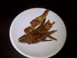 In some countries, grasshoppers are used as food.[71] In southern Mexico, grasshoppers, known as chapulines, are eaten in a variety of dishes, such as in tortillas with chilli sauce.[72] Grasshoppers are served on skewers in some Chinese food markets, like the Donghuamen Night Market.[73] Fried grasshoppers (walang goreng) are eaten in the Gunung Kidul Regency, Yogyakarta, Java in Indonesia.[74] Grasshoppers are a beloved delicacy in Uganda; they are usually eaten fried (most commonly in November and May after the rains).[75] In America, the Ohlone burned grassland to herd grasshoppers into pits where they could be collected as food.[76]