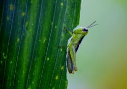 Several species such as the hooded leaf grasshopper Phyllochoreia ramakrishnai (Eumastacoidea) are detailed mimics of leaves. Stick grasshoppers (Proscopiidae) mimic wooden sticks in form and coloration.[56] Grasshoppers often have deimatic patterns on their wings, giving a sudden flash of bright colours that may startle predators long enough to give time to escape in a combination of jump and flight.[57]
