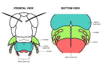 Grasshoppers have the typical insect body plan of head, thorax, and abdomen. The head is held vertically at an angle to the body, with the mouth at the bottom. The head bears a large pair of compound eyes which give all-round vision, three simple eyes which can detect light and dark, and a pair of thread-like antennae that are sensitive to touch and smell. The downward-directed mouthparts are modified for chewing and there are two sensory palps in front of the jaws.[16]