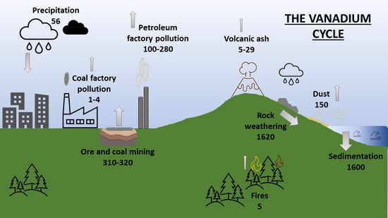 Human activity has increased the amount of vanadium emissions to the atmosphere.[2] Vanadium is abundant in fossil fuels because it is incorporated in porphyrins during organic matter degradation.[3] Coal and petroleum factory pollution release significant vanadium to the atmosphere.[1] Vanadium is also mined and using for industrial purposes including for steel reinforcement, electronics, and batteries.[1]