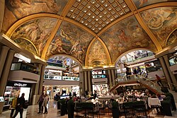 In 1919, the construction of Palacio Barolo began. This was South America's tallest building at the time and was the first Argentine skyscraper built with concrete (1919–1923).[223] The building was equipped with 9 elevators, plus a twenty-meter-high (65 ft) lobby hall with paintings in the ceiling and Latin phrases embossed in golden bronze letters. A 300,000-candela beacon was installed at the top (110 m), making the building visible even from Uruguay. In 2009, the Barolo Palace went under an exhaustive restoration, and the beacon was made operational again.