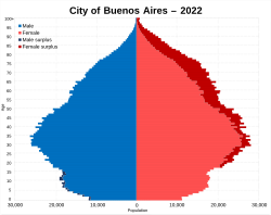 The 2001 census showed a relatively aged population: with 17% under the age of fifteen and 22% over sixty, the people of Buenos Aires have an age structure similar to those in most European cities. They are older than Argentines as a whole (of whom 28% were under 15, and 14% over 60).[75]