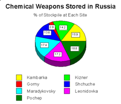 Russia entered the CWC with the largest declared stockpile of chemical weapons.[51] By 2010 the country had destroyed 18,241 tonnes at destruction facilities located in Gorny (Saratov Oblast) and Kambarka (Udmurt Republic), where operations have finished, and Shchuchye (Kurgan Oblast), Maradykovsky (Kirov Oblast), Leonidovka (Penza Oblast) while installations are under construction in Pochep (Bryansk Oblast) and Kizner (Udmurt Republic).[52] By 2016, Russia destroyed around 94% of its chemical weapons, planning to completely destroy its remaining stockpile by the end of 2018.[citation needed] On September 27, 2017 Russia announced the destruction of the last batch of chemical weapons, completing the total destruction of its chemical arsenal, ahead of schedule.[53]