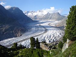 On the higher parts of lofty mountains in the Alps, more snow falls in each year than melts. A portion of this is carried away by the wind before it is consolidated, but a large portion accumulates in hollows and depressions of the surface and is gradually converted into glacier ice which descends by slowly flowing into the deeper valleys where it help swell perennial streams.