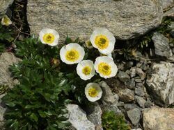 Given the extremely harsh climatic conditions of this zone, few plant species can find a favorable environment to thrive. A few high altitude plants, however, manage to grow in certain crevices of rocks sometimes at very high altitudes. A specimen of glacier buttercup was found at the top of the Finsteraarhorn at an altitude of more than 4,200 metres (13,800 ft) In the glacial zone, the species distribution is very different between calcareous and siliceous rocks. On limestone rock, we can find Androsace helvetica, saxifrages, Athamanta cretensis, and Draba tomentosa. On siliceous rock, one will come across Androsace vandellii, two characteristic species of houseleek (Sempervivum montanum and Sempervivum arachnoideum), and various saxifrages (e.g., Saxifraga aspera).