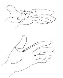 The flap is taken from the radial side of the index finger. It is proximally based at the distal edge of the thumb-index web. The flap is made as wide as possible, but still small enough to close with the excessive skin on the palmar side of the index finger. The flap is rotated around the tightest part of the thumb to the metacarpophalangeal joint of the thumb, allowing for a larger range of motion.[52]