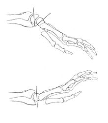 Children with the amyoplasia type of arthrogryposis usually have flexion and ulnar deviation of the wrists.[2] Dorsal carpal wedge osteotomy is indicated for wrists with excessive flexion contracture deformity when non-surgical interventions such as occupational therapy and splinting have failed to improve function. On the dorsal side, at the level of the midcarpus, a wedge osteotomy is made. Sufficient bone is resected to at least be able to put the wrist in a neutral position. If the wrist also has ulnar deviation, more bone can be taken from the radial side to correct this abnormality. This position is held into place with two cross K-wires. In addition, a tendon transfer of the extensor carpi ulnaris to the extensor carpi radialis brevis may be performed to correct ulnar deviation or wrist extension weakness, or both. This tendon transfer is only used if the extensor carpi ulnaris appears to be functional enough.[51]