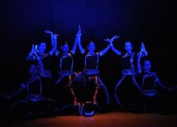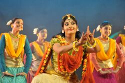 Under the patronage of royal courts, performers belonged to professional companies that were directed by a stage manager (sutradhara), who may also have acted.[14] This task was thought of as being analogous to that of a puppeteer—the literal meaning of "sutradhara" is "holder of the strings or threads".[5] The performers were trained rigorously in vocal and physical technique.[15] There were no prohibitions against female performers; companies were all-male, all-female, and of mixed gender. Certain sentiments were considered inappropriate for men to enact, however, and were thought better suited to women. Some performers played characters their own age, while others played characters younger or older than themselves. Of all the elements of theatre, the Treatise gives most attention to acting (abhinaya), which consists of two styles: realistic (lokadharmi) and conventional (natyadharmi), though the major focus is on the latter.[16]