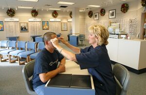 An optician is an individual who fits eyeglasses or contact lenses by filling a refractive prescription from an optometrist or ophthalmologist.[1] They are able to translate and adapt ophthalmic prescriptions, dispense products, and work with accessories.[2] There are several specialties within the field.