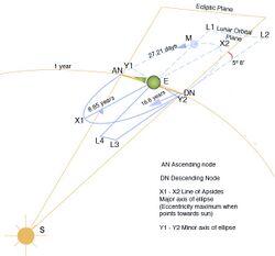 The mean inclination of the lunar orbit to the ecliptic plane is 5.145°. Theoretical considerations show that the present inclination relative to the ecliptic plane arose by tidal evolution from an earlier near-Earth orbit with a fairly constant inclination relative to Earth's equator.[8] It would require an inclination of this earlier orbit of about 10° to the equator to produce a present inclination of 5° to the ecliptic. It is thought that originally the inclination to the equator was near zero, but it could have been increased to 10° through the influence of planetesimals passing near the Moon while falling to the Earth.[9] If this had not happened, the Moon would now lie much closer to the ecliptic and eclipses would be much more frequent.[10]
