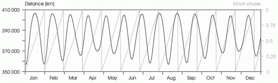 The orbit of the Moon is a nearly circular ellipse about the Earth (the semimajor and semiminor axes are 384,400 km and 383,800 km, respectively: a difference of only 0.16%). The equation of the ellipse yields an eccentricity of 0.0549 and perigee and apogee distances of 362,600 km and 405,400 km respectively (a difference of 12%).