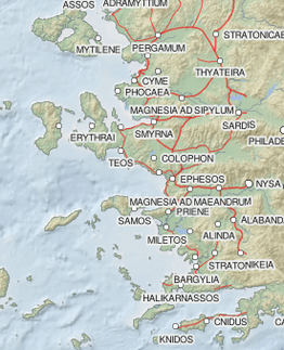 An event that happened before the Romans took full control of Anatolia was called the Asiatic Vespers, in which Mithridates organised the mass genocide of Roman citizens within his control.[6] This acted as a casus belli for the First Mithridatic War, and included the murder of anywhere between 80,000[7] to 150,000[8] Romans. This caused the Romans to declare war to soon after. There were two large cultures in Anatolia, before the Romans. The first was the Hellenic nature of the city states that had dotted the coastlines with the leftover Successor Kingdoms like Pontus that came after Alexander the Great.[3] The second culture was that there was also a significant amount of leftover Persian culture evident throughout the region. An important part of this Persian culture was the Royal Road, which was still in use by the Roman period.[9] This is also evident in the different sections of Anatolia, where the Greeks had built many buildings or areas such as the Agora which were in different City-States that populated the Ionian coast like Miletus.[10]