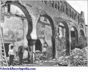 The only existing (1905) memorials of the once flourishing Jewish community are the ruins of the large and handsome synagogue which was erected simultaneously with the old synagogue in Toledo (later transformed into the Church of S. Maria la Blanca) and in the same architectural style. This, as mentioned above, was transformed into the Corpus Christi Church and given to the monks of Parrades. From 1572 it was in the possession of the Franciscan nuns, and served as a church until in later days, owing to its beauty, it was included among the national monuments. The monastery was located next to the church, on the spot where the rabbis' house formerly stood. On Aug. 3, 1899, the synagogue was destroyed by fire, nothing remaining of the old building but its massive walls and two beautiful arcades. The walls were found to be without crack or crevice or sign of repair, thus disproving the statement made by Alonso de Spina and others 500 years before, when the accusation of host-desecration was lodged against the Jews, that on account of the supposed crime "the synagogue trembled and its walls and pillars shook."