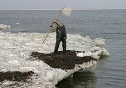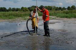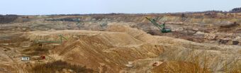 Pieces of amber torn from the seafloor are cast up by the waves and collected by hand, dredging, or diving. Elsewhere, amber is mined, both in open works and underground galleries. Then nodules of blue earth have to be removed and an opaque crust must be cleaned off, which can be done in revolving barrels containing sand and water. Erosion removes this crust from sea-worn amber.[32] Dominican amber is mined through bell pitting, which is dangerous because of the risk of tunnel collapse.[36]