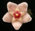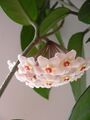 The inflorescence is made up of numerous flowers, hanging or more upright, which are grouped in an umbel. The flowers are typically light pink, but may vary from near-white to dark pink; they are star-shaped, and are borne in clusters. The thick flower corollas look as if made from porcelaine or from wax, leading to the plant's common names. The surface of the flowers is covered in tiny hairs giving them a fuzzy sheen. They are heavily scented and may produce excess nectar that drips from the flowers. A single flower (corolla) has a diameter of 1.5 to 2 cm.[4]