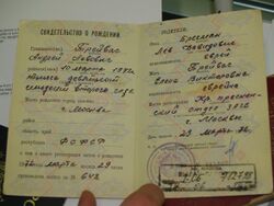 thumb|right|200px|A Russian birth certificate issued in April 2011 Earlier testimony was a small book format-bound, now it's just a page format B5, provided with watermarks. The certificate has a series and number.