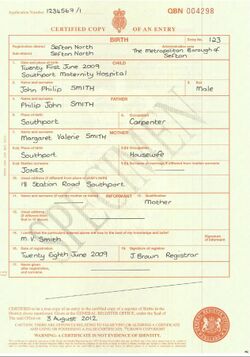 In England and Wales, the description "birth certificate" is used to describe a certified copy of an entry in the birth register.[29]