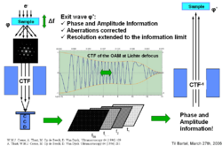 To calculate back to φe(x,u) the wave in the image plane is back propagated numerically to the sample. If all properties of the microscope are well known, it is possible to recover the real exit wave with very high accuracy.